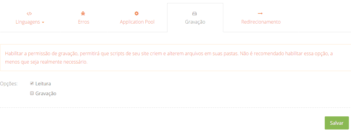 A página de Configurações Avançadas contém uma série de guias que organizam diversas configurações em seções como: redirecionamento do domínio, alterar as variáveis do PHP, permissão de gravação e a ativação do SSL compartilhado, por exemplo.